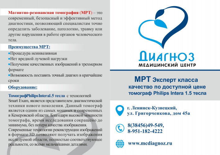 Томограф Philips Intera 1.5 тесла с технологией Smart Exam, является представителем диагностической техники нового поколения. Данный томограф является одним из самых мощных и современных в Кемеровской области. Благодаря высокой мощности томографа, время исследования сокращено до минимума, без потери качества изображения.